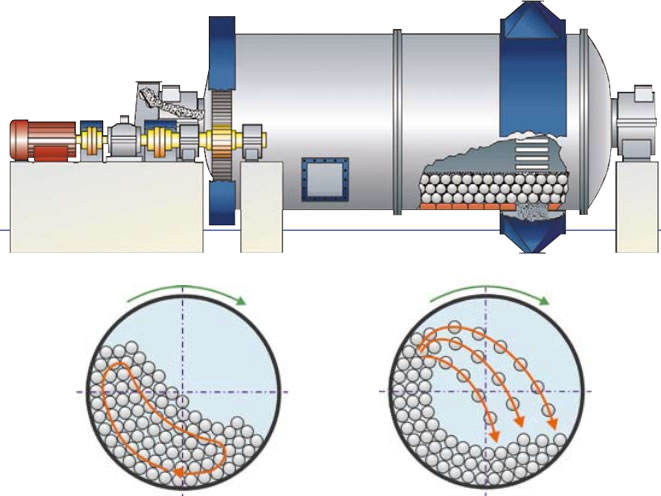 球磨機(jī)工作時(shí),物料由進(jìn)料端空心軸裝入筒體內(nèi),當(dāng)球磨機(jī)筒體轉(zhuǎn)動時(shí)候,研磨體由于慣性、離心力和摩擦力作用,使它附在筒體襯板上被筒體帶走,當(dāng)被帶到一定的高度時(shí)候,由于其本身的重力作用而被拋落,下落的研磨體像拋射體一樣將筒體內(nèi)的物料給擊碎。物料由進(jìn)料裝置經(jīng)入料中空軸螺旋均勻地進(jìn)入球磨機(jī)第一倉,該倉內(nèi)有階梯襯板或波紋襯板,內(nèi)裝不同規(guī)格鋼球,筒體轉(zhuǎn)動產(chǎn)生離心力將鋼球帶到一定高度后落下,對物料產(chǎn)生重?fù)艉脱心プ饔谩N锪显诘谝粋}達(dá)到粗磨后,經(jīng)單層隔倉板進(jìn)入第二倉,該倉內(nèi)鑲有平襯板,內(nèi)有鋼球,將物料進(jìn)一步研磨。粉狀物通過卸料箅板排出,完成粉磨作業(yè)。